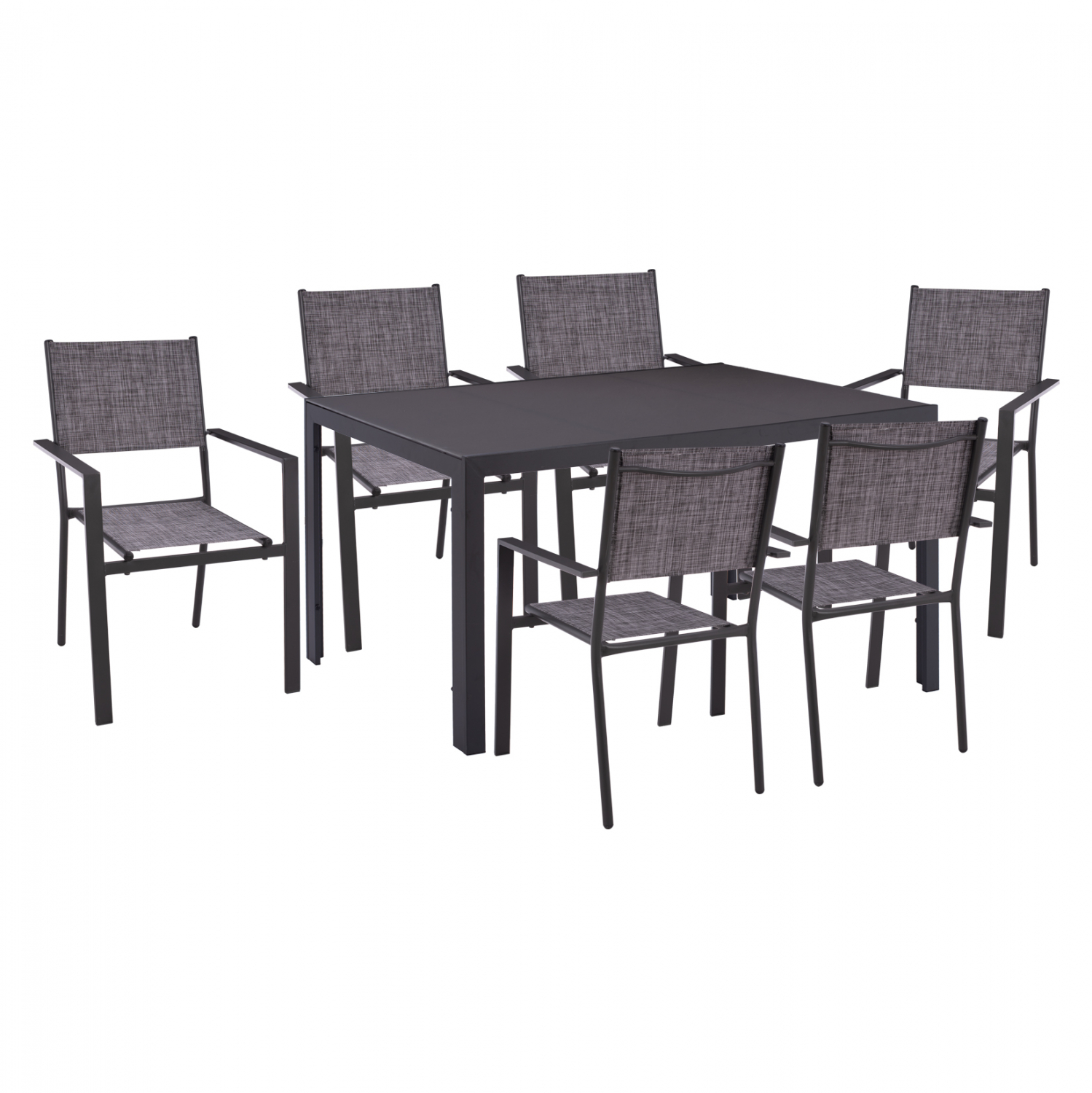 Σετ τραπεζαρίας 6 θέσεων. ΤΟ ΣΕΤ ΠΕΡΙΛΑΜΒΑΝΕΙ Ένα τραπέζι τραπεζαρίας εξωτερικού χώρου σε γκρι απόχρωση με γυαλί στην επιφάνειά του. Είναι ανθεκτικό καθώς είναι κατασκευασμένο από μέταλλο και αυτό το καθιστά κατάλληλο για χρήση σε εσωτερικούς αλλά και εξωτερικούς χώρους. Διαστάσεις: 150x90x75 εκ. Έξι μοντέρνες πολυθρόνες εξωτερικού χώρου κατασκευασμένες από μέταλλο σε γκρι απόχρωση, με textiline σε γκρι χρώμα. Κατασκευασμένη για μεγάλη αντοχή στον ήλιο και στην βροχή. Διαστάσεις: 57x56x90 εκ. Διαστάσεις καθίσματος: 40x45 εκ. Διαστάσεις πλάτης: 46x31,5 εκ. Απόσταση ποδιών: 52x53 εκ. Ύψος μπρατσου: 62 εκ. Υψος καθίσματος: 45 εκ. Ύψος ποδιών: 42 εκ. Χρώμα μετάλλου: Γκρι Χρώμα textiline: Γκρι Ιδανική για επαγγελματικούς χώρους αλλά και για το σπίτι σας, θα σας χαρίσει άνεση και ξεκούραση.