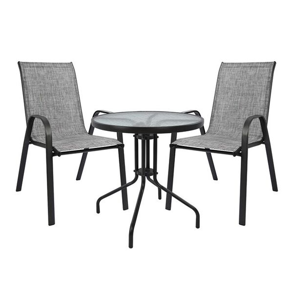 ΤΟ ΣΕΤ ΠΕΡΙΛΑΜΒΑΝΕΙ Ένα τραπέζι μεταλλικό εξωτερικού χώρου σε χρώμα γκρι-ανθρακί, με ενσωματωμένο τζαμί ασφάλειας (secure). Διαστ. Τραπεζιού: Φ60x72 εκ. Δύο πολυθρόνες εξωτερικού χώρου από μεταλλικό σκελετό σε γκρι χρώμα με textilene 2x1 μεγάλης αντοχής σε ήλιο και βροχή. Διαστ. Καρέκλας: 54x70x93 εκ. Ύψος καθίσματος: 43 εκ. Ύψος μπράτσων: 59 εκ.