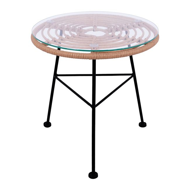 Μοντέρνο τραπέζι εξωτερικού, αλλά και εσωτερικού χώρου, κατασκευασμένο από μεταλλικό σκελετό σε μαύρη απόχρωση και επιφάνεια επενδυμένη με πλεκτό wicker σε μπεζ απόχρωση. Επίσης διαθέτει γυάλινη επιφάνεια. Το wicker έχει μεγάλη ανθεκτικότητα σε υψηλές και χαμηλές θερμοκρασίες από (-85c έως +85c.), ακόμα είναι εμπλουτισμένο με σταθεροποιητή UV για τις ακτίνες του Ήλιου. Ιδανικό για χώρους εστίασης αλλά και για το σπίτι σας. Διαστάσεις: Φ45 εκ. Ύψος τραπεζιού: 46 εκ. Διαστάσεις ποδιών: 43x43 εκ.