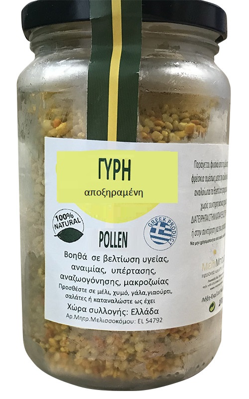 Η γύρη είναι ένα από τα πιο πολύτιµα προϊόντα της µέλισσας, ίσως το δεύτερο στη σειρά µετά το βασιλικό πολτό. Βρίσκεται στα άνθη των φυτών, από όπου την συλλέγουν οι μέλισσες και την μεταφέρουν στην κυψέλη τους. Αποτελεί την καθημερινή και βασική τροφή των μελισσών και του γόνου τους. Η συλλογή της γύρης γίνεται τοποθετώντας ειδικές παγίδες στην είσοδο της κυψέλης, ενώ η γεύση και το χρώμα της ποικίλει ανάλογα με την ανθοφορία. Η γύρη είναι πλούσια φυσική τροφή σε βιταμίνες, πρωτεΐνες, απαραίτητα αμινοξέα, ένζυμα και άλλα χρήσιμα συστατικά μεγάλης βιολογικής αξίας για τον ανθρώπινο οργανισμό.Η αποξηραμένη γύρη έχει υποστεί επεξεργασία απομάκρινσης της υγρασίας της, με αποτέλεσμα την μεγάλο χρόνο διατήρησης χωρίς κίνδυνο αλοίωσης και βέβαια την συντήρηση εκτός ψυγείου με δυνατότητα εύκολης μεταφοράς και σε μακρινές αποστάσεις. Τρόπος Χρήσης:35γρ γύρης ημερησίως, καλύπτουν της ανάγκες μας σε βιταμίνες, πρωτεΐνες και ιχνοστοιχεία. Ξεκινήστε με μικρές ποσότητες.Μπορείτε να την αναμίξετε με μέλι, γιαούρτι, γάλα, δημητριακά, χυμούςΠροτείνουμε μισό κουταλάκι του γλυκού ημερησίως για την πρώτη εβδομάδα. Εν συνεχεία αυξάνουμε ώστε να συνηθίσει ο οργανισμός στη 1 κουταλιά της σούπας. Αν θέλετε να πετύχετε απώλεια βάρους, προτείνεται η κατανάλωση προ φαγητού.Αν θέλετε να πετύχετε αύξηση βάρους, προτείνεται η κατανάλωση μετά φαγητού.Παιδιά 3-5 ετών: 5γρ/ημέραΠαιδιά 6-12 ετών: 10γρ/ημέραΆνω των 12 ετών και ενήλικες: 15γρ/ημέρα