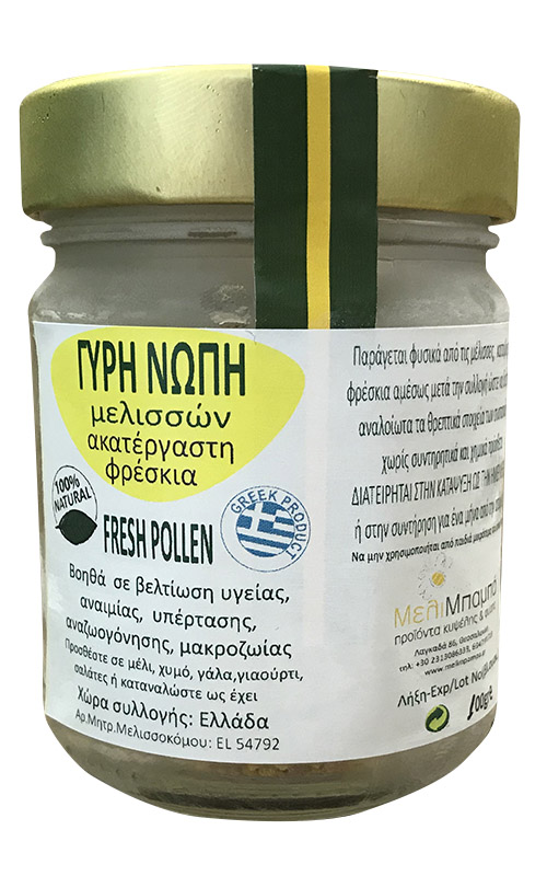 Η γύρη είναι ένα από τα πιο πολύτιµα προϊόντα της µέλισσας, ίσως το δεύτερο στη σειρά µετά το βασιλικό πολτό. Βρίσκεται στα άνθη των φυτών, από όπου την συλλέγουν οι μέλισσες και την μεταφέρουν στην κυψέλη τους. Αποτελεί την καθημερινή και βασική τροφή των μελισσών και του γόνου τους. Η συλλογή της γύρης γίνεται τοποθετώντας ειδικές παγίδες στην είσοδο της κυψέλης, ενώ η γεύση και το χρώμα της ποικίλει ανάλογα με την ανθοφορία. Η γύρη είναι πλούσια φυσική τροφή σε βιταμίνες, πρωτεΐνες, απαραίτητα αμινοξέα, ένζυμα και άλλα χρήσιμα συστατικά μεγάλης βιολογικής αξίας για τον ανθρώπινο οργανισμό. Η φρέσκια γύρη που παρέχουμε, δεν έχει υποστεί επεξεργασία και αμέσως μετά την συλλογή της διατίθεται ακατέργαση απευθείας από την κατάψυξη, με αποτέλεσμα να διατηρεί αναλείωτα όλα τα πολύτιμα συστατικά της. Τρόπος Χρήσης:35γρ γύρης ημερησίως, καλύπτουν της ανάγκες μας σε βιταμίνες, πρωτεΐνες και ιχνοστοιχεία. Ξεκινήστε με μικρές ποσότητες.Μπορείτε να την αναμίξετε με μέλι, γιαούρτι, γάλα, δημητριακά, χυμούςΠροτείνουμε μισό κουταλάκι του γλυκού ημερησίως για την πρώτη εβδομάδα. Εν συνεχεία αυξάνουμε ώστε να συνηθίσει ο οργανισμός στη 1 κουταλιά της σούπας. Αν θέλετε να πετύχετε απώλεια βάρους, προτείνεται η κατανάλωση προ φαγητού.Αν θέλετε να πετύχετε αύξηση βάρους, προτείνεται η κατανάλωση μετά φαγητού.Παιδιά 3-5 ετών: 5γρ/ημέραΠαιδιά 6-12 ετών: 10γρ/ημέραΆνω των 12 ετών και ενήλικες: 15γρ/ημέρα Λόγω ευπαθούς προϊόντος σε περίπτωση αλλοίωσης, δεν φέρουμε ευθύνηΔιατηρείται στην κατάψυξη ή εφόσον αποψυχθεί στη συντήρηση (χωρίς να ξανακαταψυχθεί)