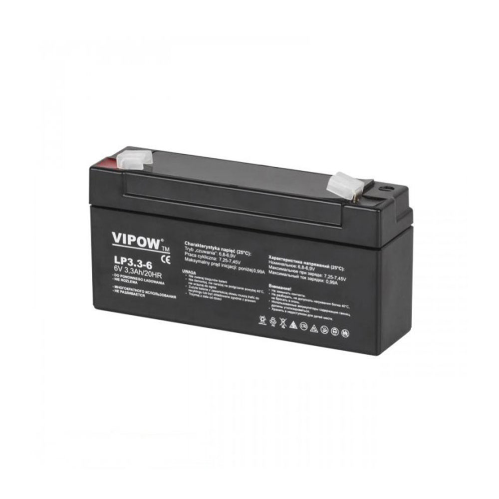 Τάση: 6V Χωρητικότητα: 3.3Ah ΔιαστάσειςΜήκος: 134mm Πλάτος: 34mmΎψος: 60mm Συνολικό ύψος (με τερματικά): 67mm Βάρος: 0,69 kg Χαρακτηριστικά Κατάσταση "αναμονής" (25° C): 6.8-6.9V Κυκλική εργασία (25° C): 7.25-7.45V Μέγιστο ρεύμα έναρξης