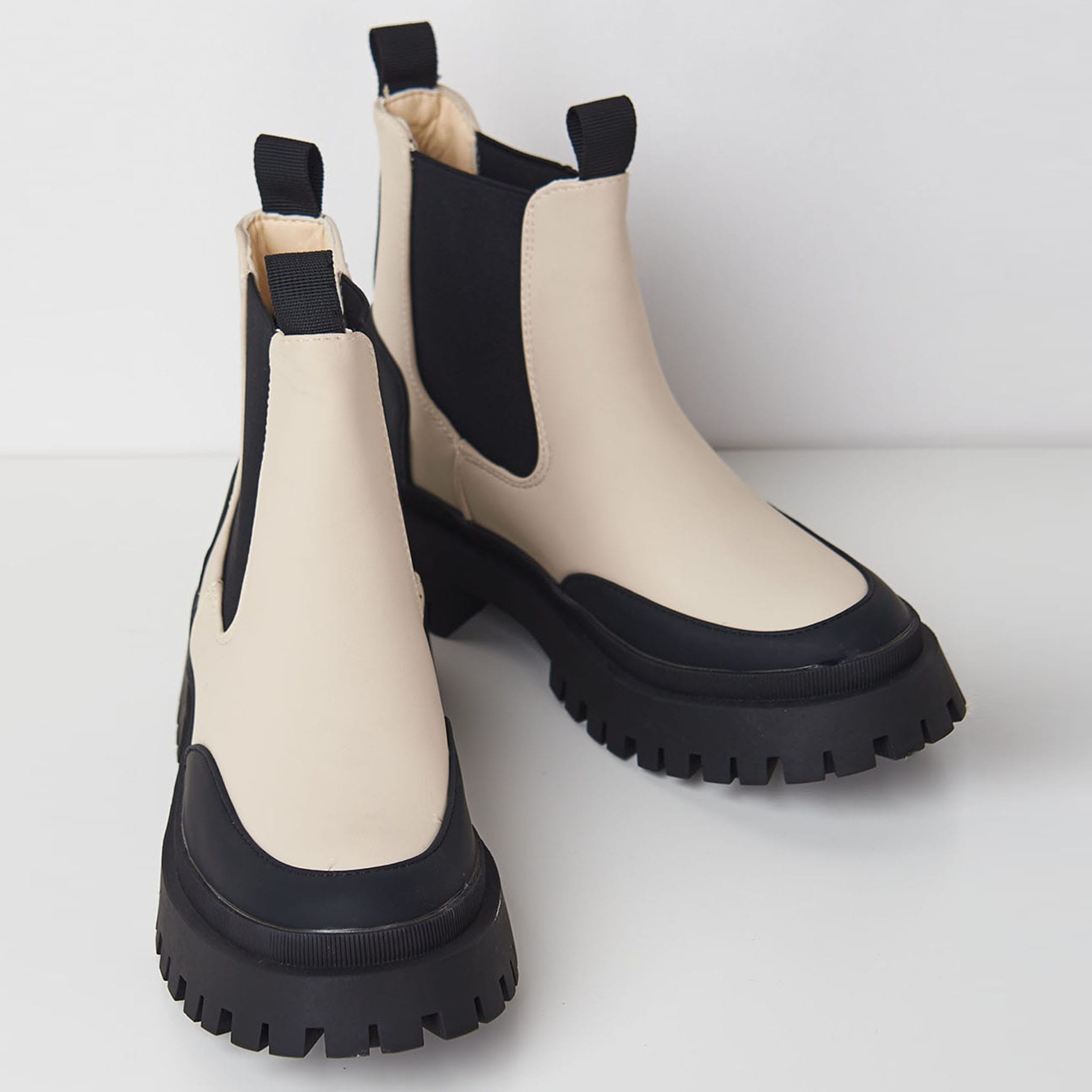 Χαμηλό μποτάκι με διχρωμία. Πλαϊνά ελαστικά μέρη για εύκολη slip-on εφαρμογή. Διπλό θηλάκι στο πάνω μέρος. Τρακτερωτή σόλα. Συνολικό ύψος : 16,5 εκ. Ύψος σόλας : 4 εκ.
