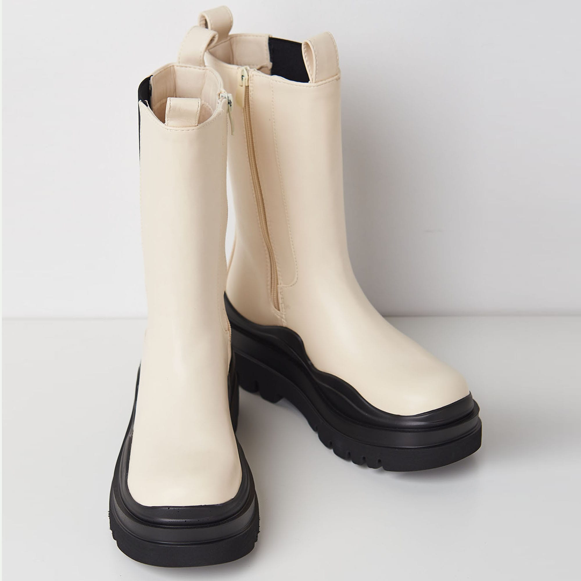 Leather look μποτάκι με ελαστικό πλαϊνό μέρος. Διπλό θηλάκι στην κορυφή. Τρακτερωτή chunky σόλα σε χρωματική αντίθεση με wavy σχέδιo. Κλείνει με φερμουάρ. Συνολικό ύψος : 28,5 εκ. Ύψος σόλας : 5 εκ.