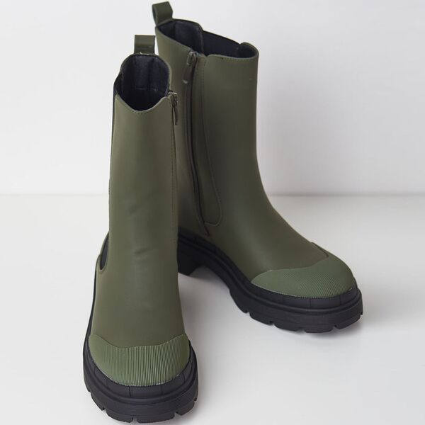 Μποτάκι από leather look υλικό με στρογγυλή ανάγλυφη μύτη από καουτσούκ. Ελαστικό πλαϊνό τμήμα. Θηλάκι στην κορυφή. Τρακετρωτή σόλα με ανάγλυφο σχέδιο. Κλείνει με φερμουάρ. Συνολικό ύψος : 24,5 εκ. Ύψος σόλας : 3,5 εκ.
