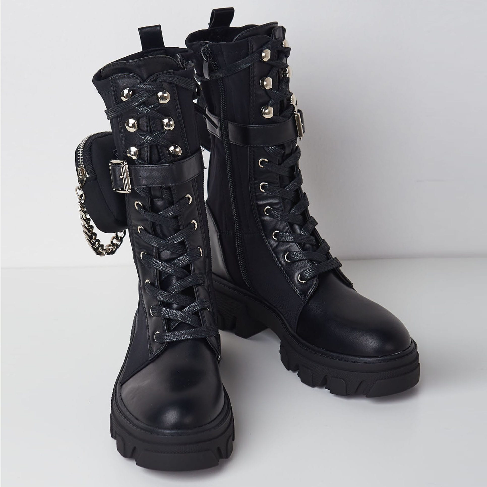 Lace up μποτάκι από συνδυασμό υλικών. Εύκαμπτο πάνω μέρος με λεπτομέρεια λουράκι και αποσπώμενο αξεσουάρ. Τρακτερωτός πάτος με ανάγλυφα σχέδια. Συνολικό ύψος : 27,5 εκ. Σόλα : 4,5 εκ.