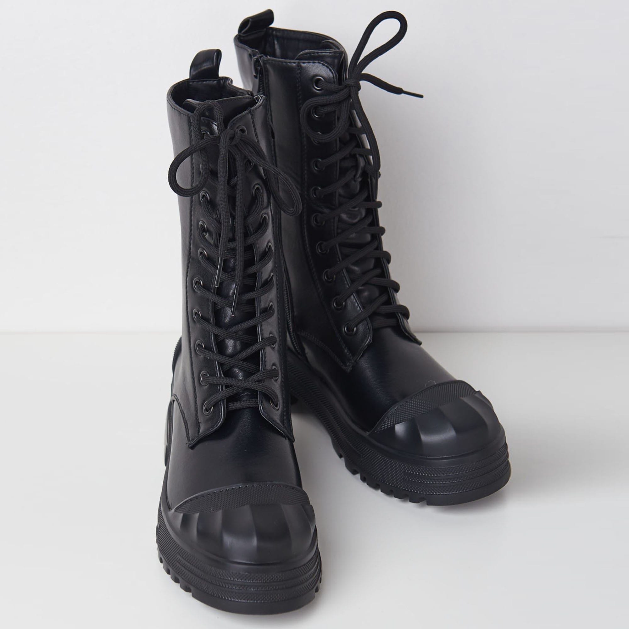 Μποτάκι από συνδυασμό υλικών. Lace up σχέδιο με θηλάκι στην κορυφή. Ανάγλυφο σχέδιο από καουτσούκ σε μύτη και φτέρνα. Τρακτερωτή σόλα . Κλείνει στο πλάι με φερμουάρ. Συνολικό ύψος : 26,5 εκ. Σόλα : 5 εκ.