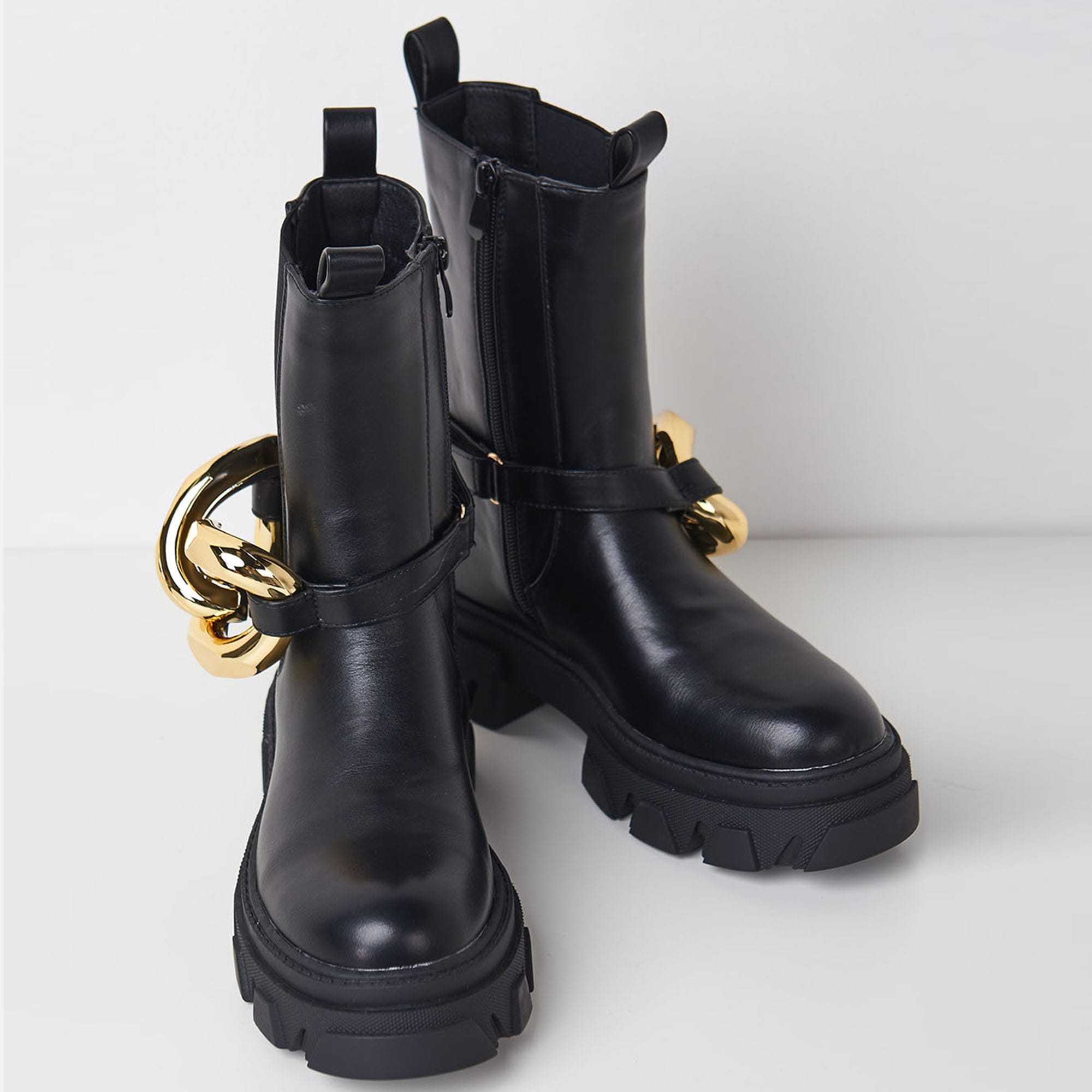 Μποτάκι από συνθετικό δέρμα εξαιρετικής ποιότητας με chunky τρακτερωτό πάτο. Διακοσμητική αλυσίδα που κουμπώνει και αφαιρείται με σχράτς. Ελαστκό πλαϊνό μέρος. Διπλό θηλάκι στην κορυφή. Κλείνει στο πλάι με φερμουάρ. Συνολικό ύψος : 25 εκ. Σόλα: 5 εκ.